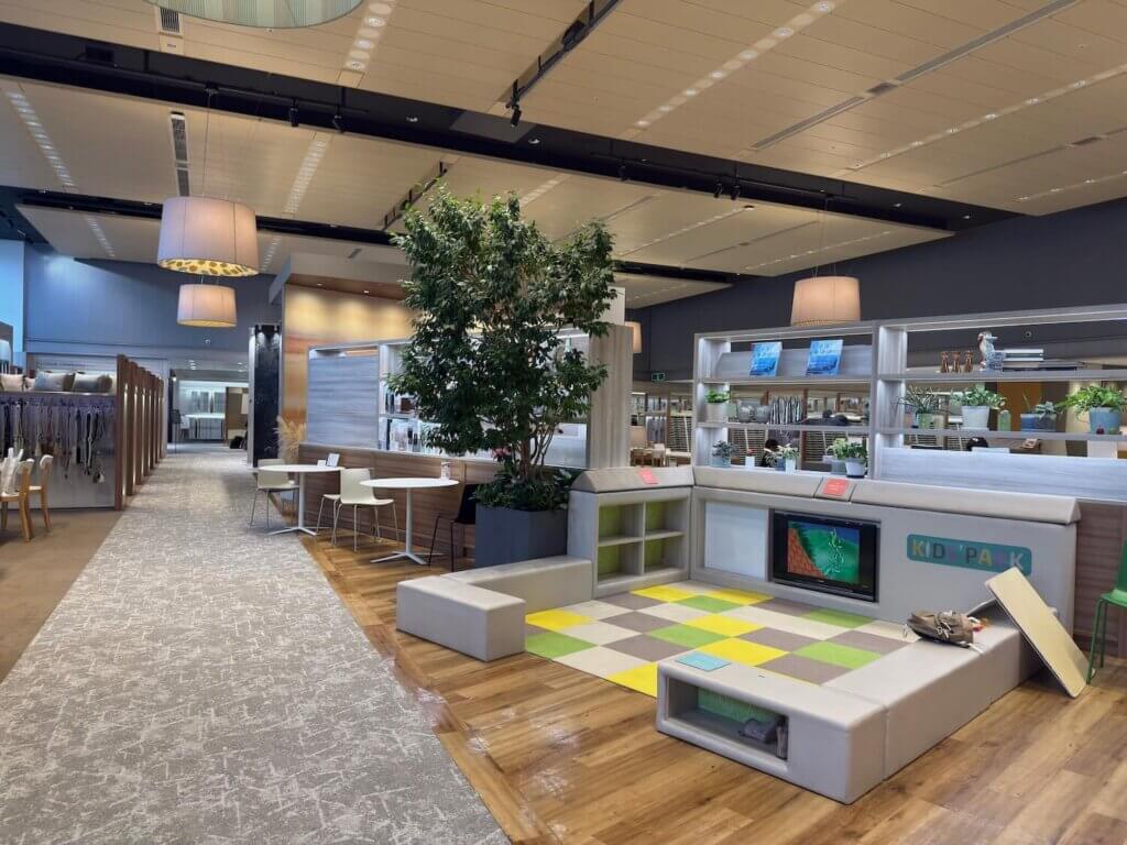 入ると左に壁クロス、左奥にカーテン、右に床(クッションフロア等)が展示してあります。