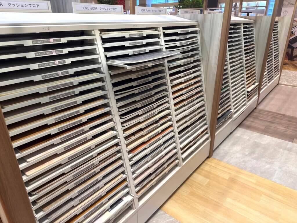 クッションフロアは、壁のクロス程大きくはありませんが、一覧で展示してあります。この引き出しを引っ張り出しながら選んでいきます。