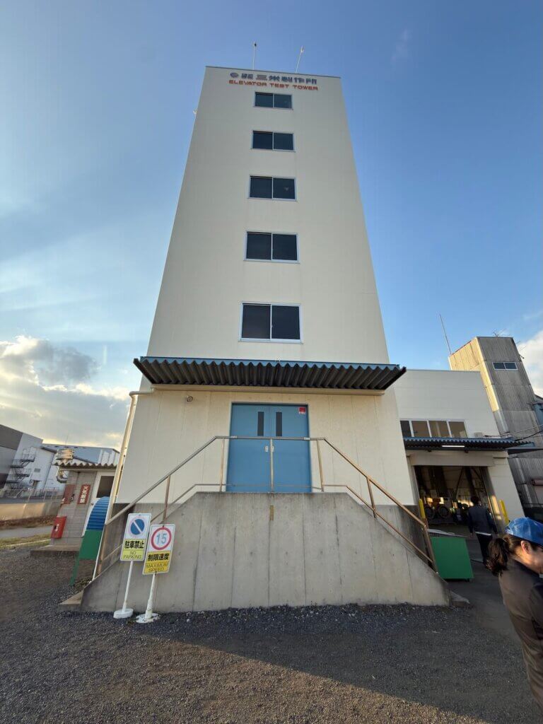 遠くからも見えるのがこちら、工場の象徴的な建物として目立つエレベーターの実験棟です。