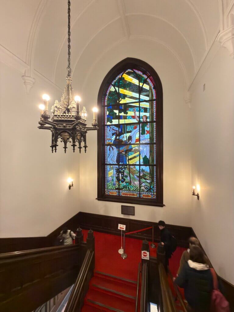 階段には、大きなステンドグラスがあります。これは再現したものだそうです。それにしても、キレイな階段ホールです。