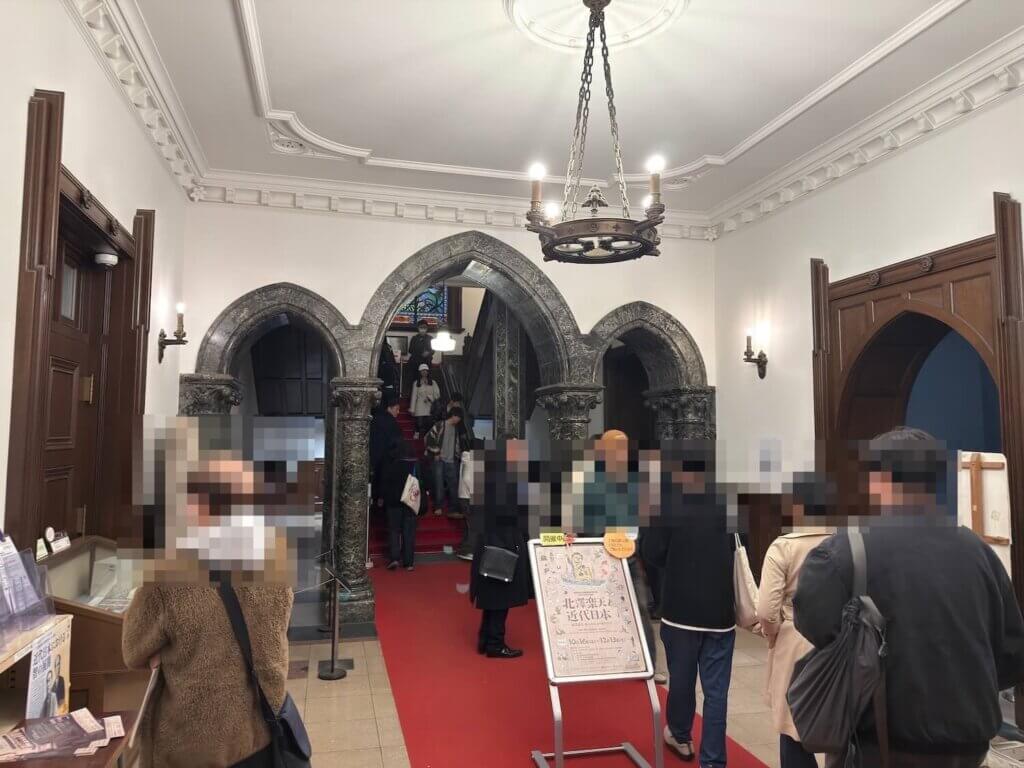 玄関を入ると、このようなホールがあります。右にはカフェがあります。展示スペースは2階。このアーチを通って2階に進みます。