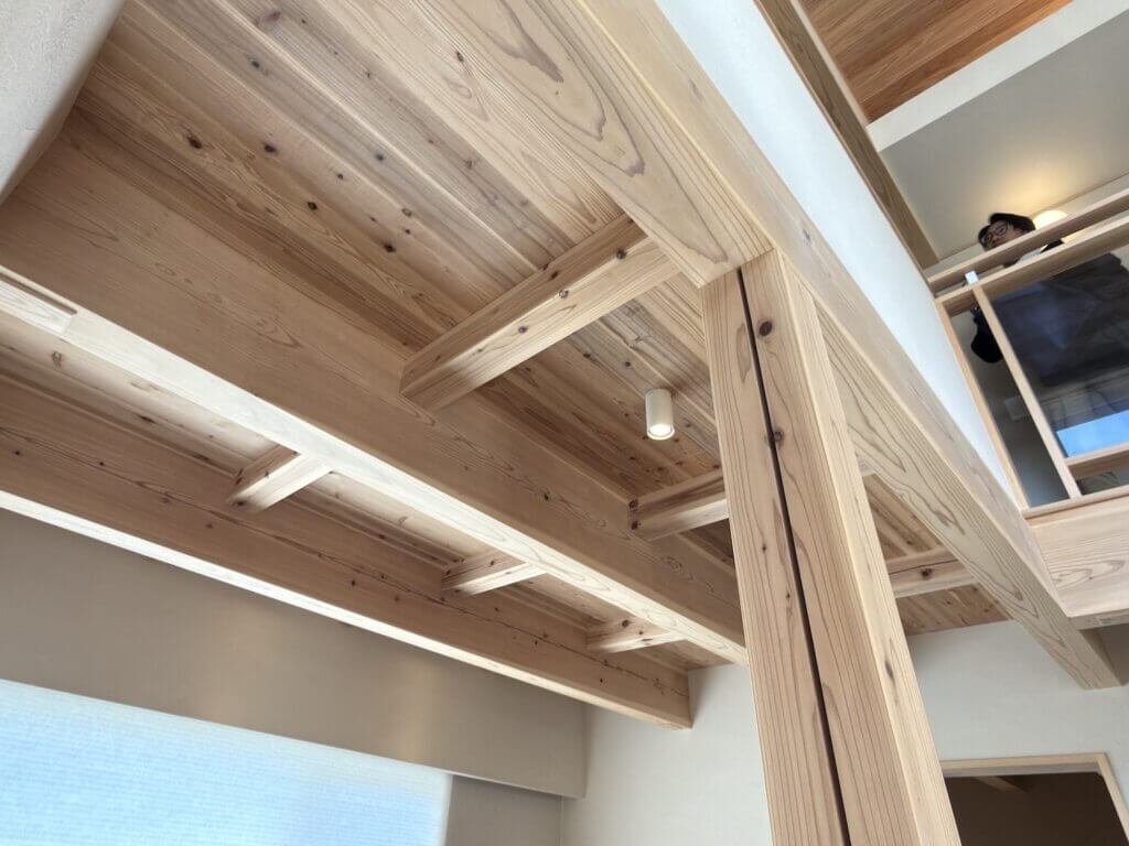 玄関からリビングに入った時に見える柱と梁です。