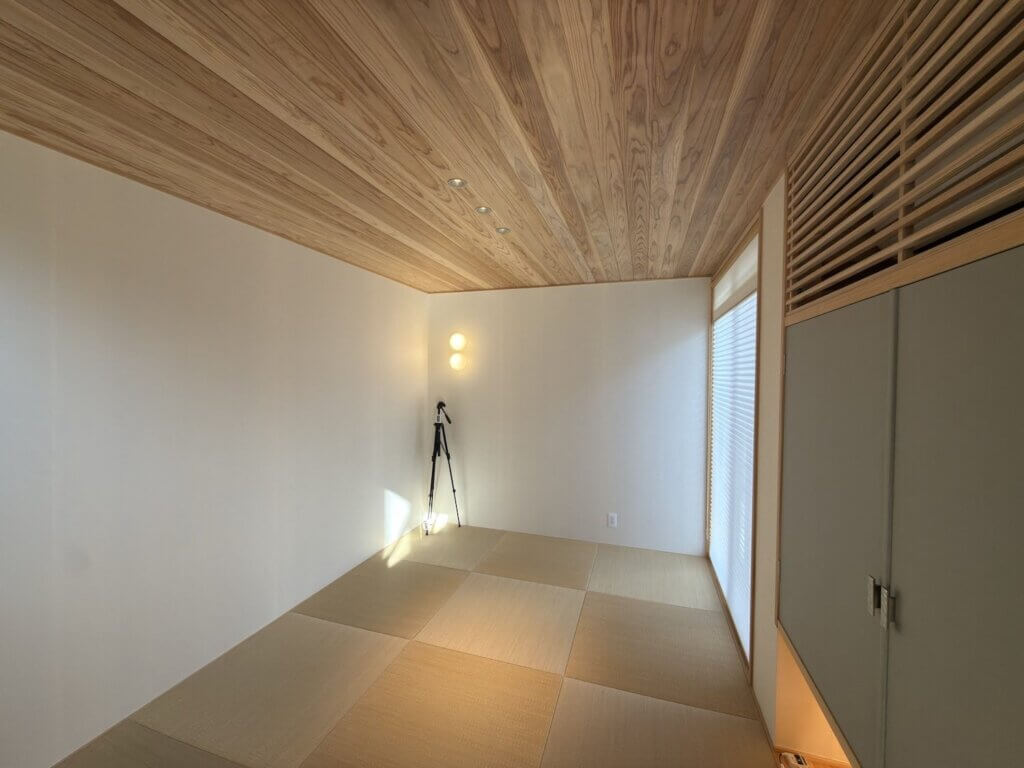 壁仕上げ材に繋ぎ目がありますね。これは壁に和紙を利用しているからです。仕上げ材にも自然素材にこだわっています。