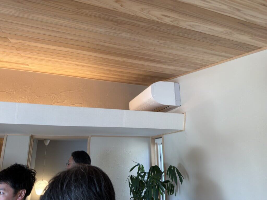 どうなっているのかと思ったら、エアコンの下にある天井の部分が溝になっていて、2階の各部屋に冷気を流すのだそうです。