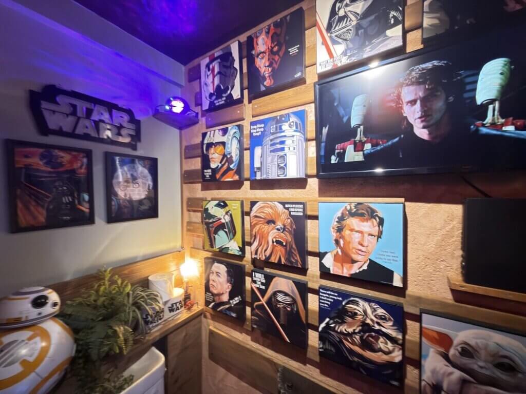 懇親会会場のトイレには、スターウォーズのパネルやフィギア、グッズが所狭しと飾ってありました。いや、すげ〜〜〜!