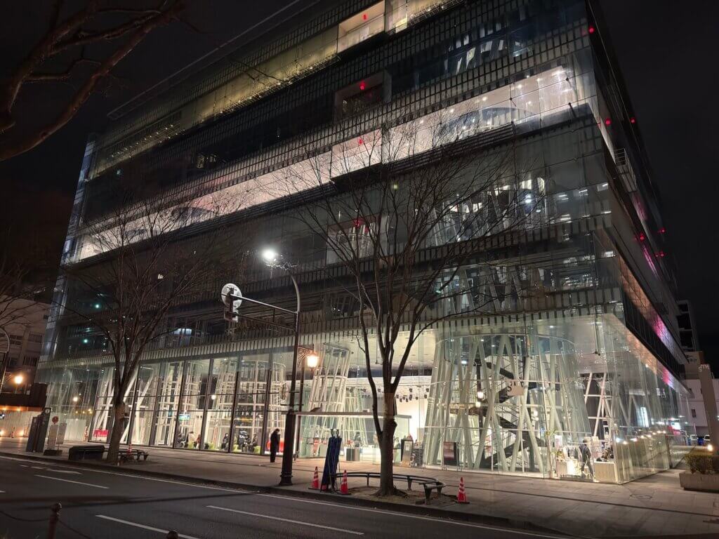 「せんだいメディアテーク」の前に人が集まり始めていました。カメラマンが三脚を設置したり。何があるのだろうと思っていたら、19時からイルミネーションが始まりました。