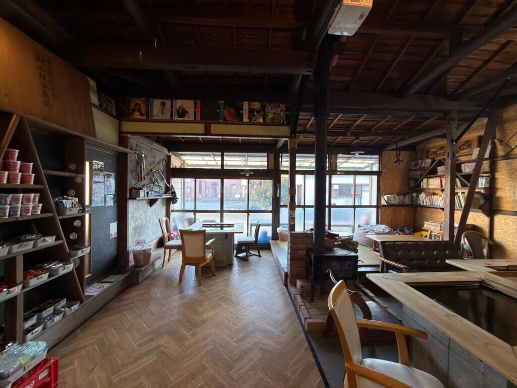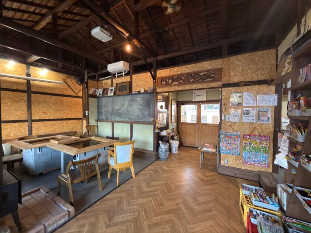 「基地ひるね」の中は広くて、子供達もリラックス出来そうです。黒板があったり、どこかの教室みたい。民家を改造しているようで、小屋裏の中まで丸見えです。