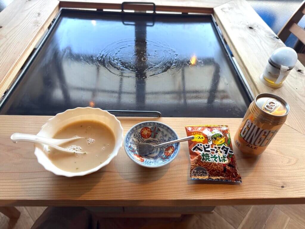 左の皿に入った、汁のようなもの。私が子供の頃食べた「もんじ」は基本的に具なしでしたが、こちらは豪華に海苔が入っていました。