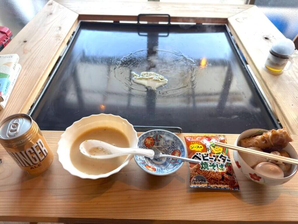 「基地ひるね」の中に入ると、大きな鉄板が3枚ありました。焼肉屋お好みやできでももんじゃ焼きでもありません。もんじ用の鉄板です。