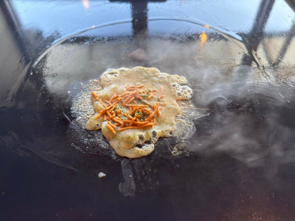 これを鉄板に広げて焼いていきます。と言っても、トロトロの状況で、熱々を食べます。しっかり焼いて、お煎餅にしても美味しいし。焦げて硬くなった部分もしょっぱくて美味しい。