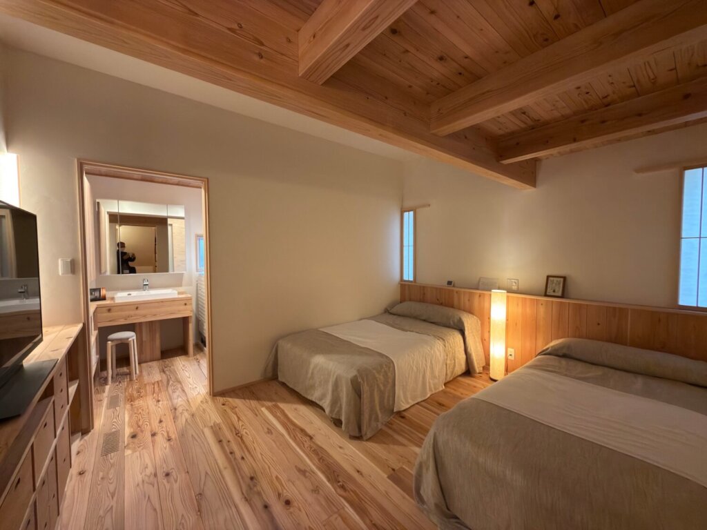 寝室も、落ち着いた雰囲気です。上に見える梁と床が、先ほど森さんが座っていたエアコンのあるロフトです。床の奥側はロフトと繋がっていますが、きっと冷気が落ちすぎるのでしょう。布で塞いで、反対側から落ちる冷気で十分冷えるのだと思います。
