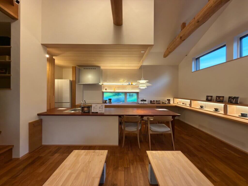 こちらがダイニングキッチン。落ち着いた良い雰囲気です。リフォームなので、吹き抜け部分には太鼓梁(丸太のままの梁)が見えています。