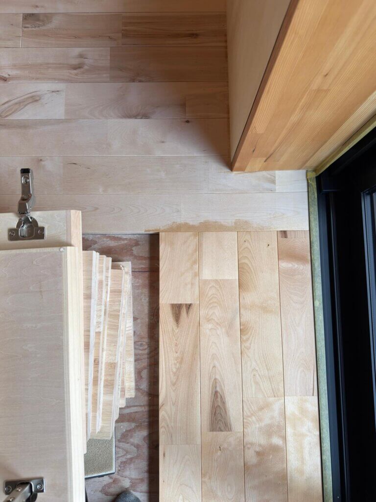 床も塗りました。下側の縦の床が塗装ずみ、上の横の床が未塗装です。ここも、時間が経つと色がもっと変わって木目がもっとキレイに浮き出てきます。