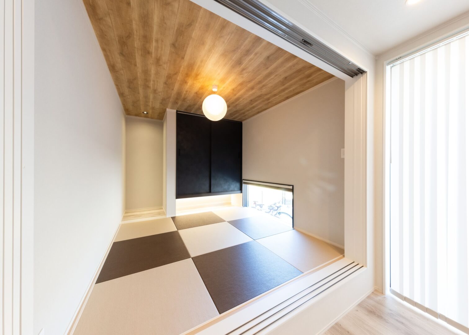 LDKに隣接したモダンな市松敷きの和室は、シーンに合わせて役割を変える魔法の空間。扉を開け放てばリビングの一部として広々と、来客時には客間として、そしてお子様のお昼寝スペースとして、小上がりになっているので腰をおろしてソファ代わりに変幻自在に暮らしをサポートします。