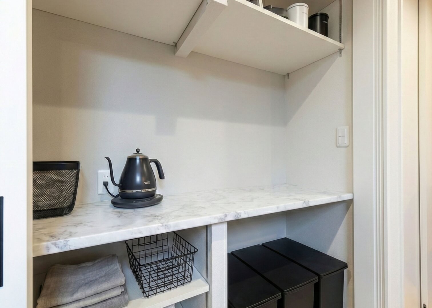使う場所のすぐそばに「サッと隠せる収納」があることで、ゴチャつく日用品があっという間に姿を消し、いつでも美しいLDKを保ちます。