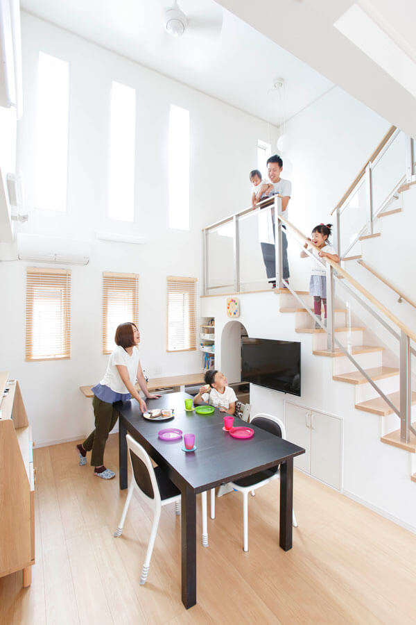 吹き抜けの明るいダイニングで午後のひとときを過ごす土橋様ご夫妻と3人のお子様たち。床暖房や壁の断熱材にこだわり、室内の空気を循環させるシーリングファンも設置して、快適な空間をつくるよう努めた。