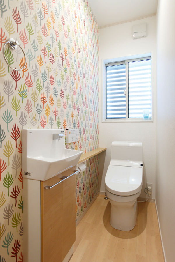 奥様が北欧をイメージして選んだという壁紙がかわいらしい1階のトイレ。