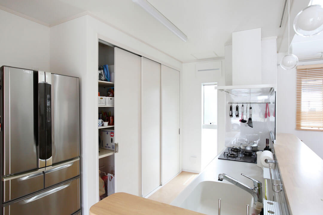 「行き止まりをつくると、そこに物を置いてしまうから」と、キッチンは柱の奥を通路にしたアイランド型。背面収納の中には換気扇と電源を付けて電子レンジや炊飯器もしまえるようにした。
