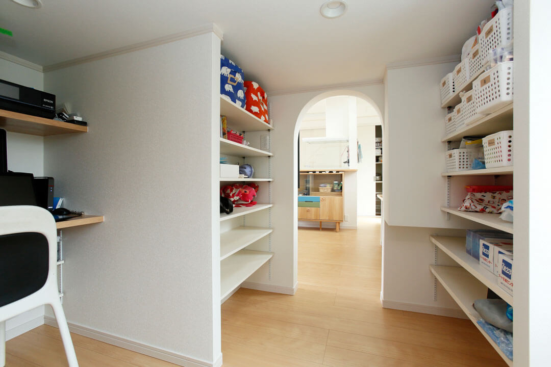 階段のスキップフロア下にはパソコンデスクとパントリーがある隠れ家のような空間。アーチ型の入口で遊び心も満載。