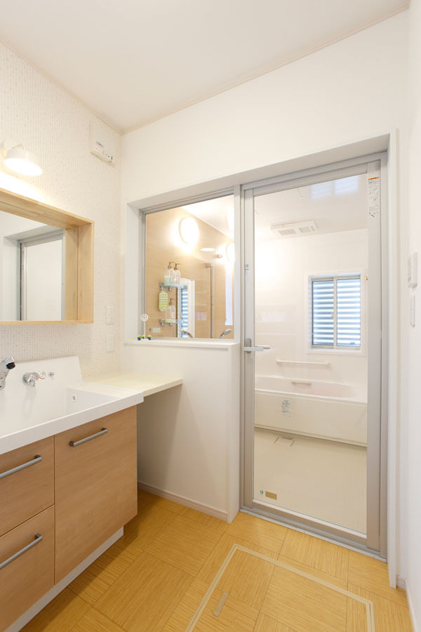 浴室のドアと壁は奥様の希望で透明ガラスに。洗面台との間に板を渡して着替え置き場も完備。