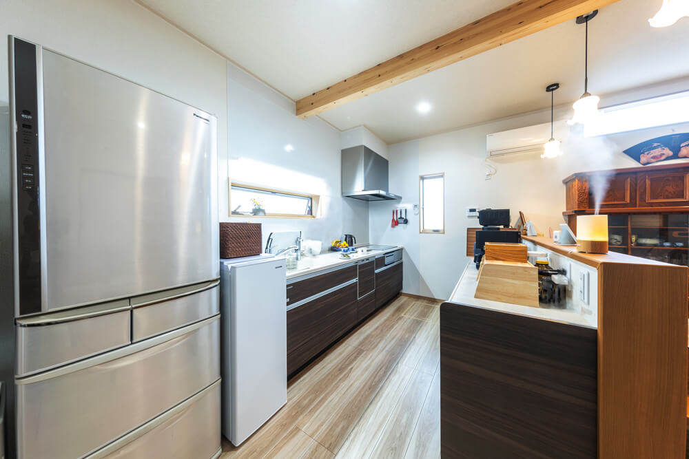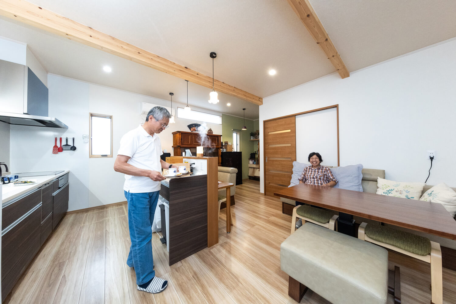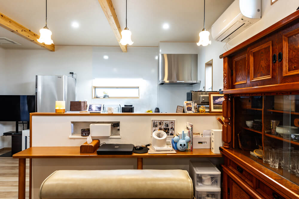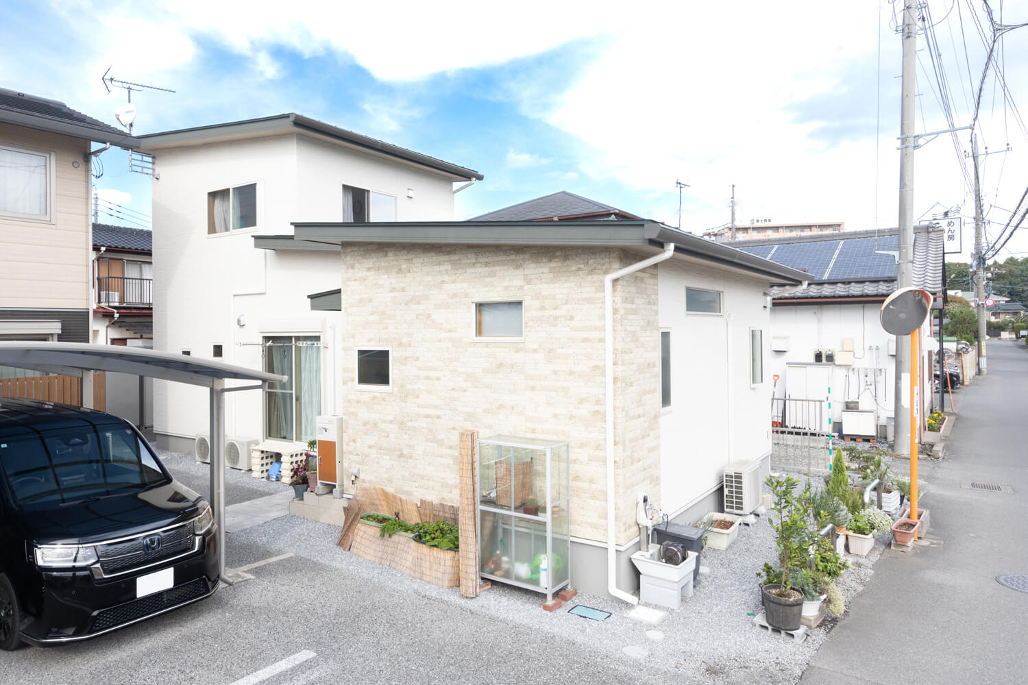趣味と今の暮らしを大切に将来を見据えた2人にちょうどいい家 2026年4月1日 最終更新日時 : 2026年3月4日 shome_admin O様 蕎麦店を経営していた時には、すべて手作業で蕎麦を打っていたというご主人だけあって、奥様と二人でキッチンに立つことも多いという。その分、キッチンとカウンター間のスペースは広く確保してある。食事をとるのは、右手のダイニングテーブル。キッチンからは配膳しやすい距離感だ。 箪笥は以前からお持ちのもの︒処分も考えたが︑右の鎌倉彫の箪笥などは今買おうとすると高額になっていることから、持ち込むことに。エアコンのある壁側が南側だが、窓を極力減らした。温度の効率がよく、防犯上も有効だ。 カウンターで食事をすることも考えていたが、今はダイニングテーブルで食事している。ニッチに複数の電源を設置しているので、パソコン、携帯の定位置になっていて、便利スペースとして活躍している。 キッチンは壁付に。洗い物をしながらテレビが見られないこと以外は不満がないとのこと。「換気扇を部屋の端に設置したので、エアコンを最適な位置に設置できました 」とご主人。奥様は、「 換気扇は油汚れのことを考えると端がよかった」とメリットも多い。ご主人は、各部屋ごとのエアコンを使うが、リビングと趣味部屋の間の襖を開ければ、直接エアコンの空気が流れるため、奥様お一人の時は、キッチンのエアコン1台で1階は間に合わせている。 LDK と1階の洋室は襖を隔てているだけで、廊下は設けていない。お子様、お孫さんたちが来た時などは、襖を開けて広い空間として活用している。 将来寝室になる予定の1階洋室は、現在は趣味の部屋。オーディオセットと食器棚のアンティークなコレクションはご主人の趣味。奥様は趣味を超えたお仕事として着物の着付けを行うので、そのためのスペースとして、また着物類をしまって置く場所として活用している。 手に入れた鹿沼組子を家のどこかに使いたいと検討し、この窓にはめることに。LDKの他のとは趣を異にしたグリーンの和紙クロス、鎌倉彫の箪笥、かわいいペンダントライトなどもあいまって、特別なスペースが和のテイストでまとめられている。 トイレは、「安いものをわざと選びました」と言うご主人。電気的なものは壊れたら全部とりかえる必要があるが、電気的なものは使っていないので、壊れても部品を取り替えるだけですむ。「老後に急にお金がかかるようにはしたくない」というこだわりだと言う。ウォシュレットは後付けできるが必要を感じず、現在は付けていない。 玄関正面の壁は、大谷石に似た外壁材を使った。「本当は大谷石を使いたかった」というご主人だが、「職人さんが凹凸を付けセンスよく設置してくれ、夜は天井からの間接照明の影もいい雰囲気です」と、大満足。絵を飾るレールも用意したが、この壁の雰囲気がいいので、今は使っていない。 階段は通常よりも1段増やして緩やかな勾配にしてある。降りる時も安心。 2階の寝室。2面に窓があり明るい。「2階は1部屋だけで、トイレもあるので、どうしても隔離が必要な場合には、ここにいればすみます」と奥様。 収納はたっぷり。左は深い押入れ、右はクローゼット。中央のロールカーテンの中は、趣味のものが収められている。押入れの半分の深さで、反対側はその半分のスペースに洗面が設置されている。 トイレにも手洗いが付いていてあまり使わないが、2階で窓掃除など、水を使う時にはないと不便だという。 洗面脱衣室は脱ぎ着しやすいように広めに取った。車椅子が入っても余裕で回れるようになっている。 洗濯機の選び方もトイレ同様、なるべくシンプルなつくりのもので洗剤自動投入機能がない機種を選んだ。 下着や普段着はここに収納。洗濯物も簡単に片付けられ、洗剤類やトイレ用品はここに集約している。「収納はできるだけまとめたい。ありすぎると探してしまうから」と奥様。動きに無駄がないように考えられている。 蕎麦屋店は めても、県内でお料理教室を行なっていたり、奥様は着付けなどでもかけまわり、活発に活動されているO様ご夫妻。快適なお家で日々の生活も楽しんでいる。 O様邸の外観は、南側にあまり窓を設けておらず、玄関も南側の道路から見えないように設計されている。玄関側は、大谷石風の外壁材を使用してアクセントを付けている。