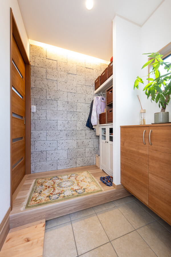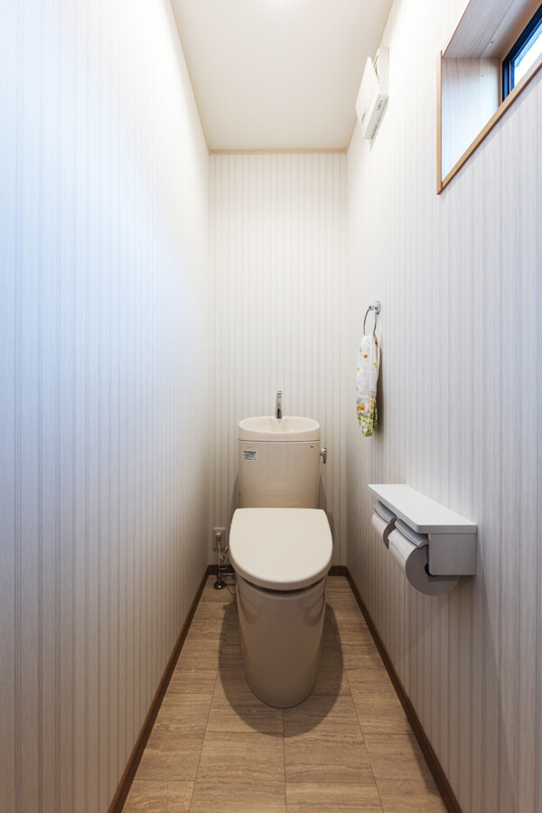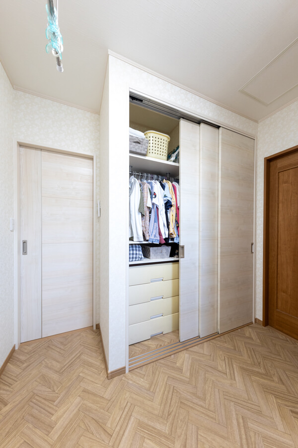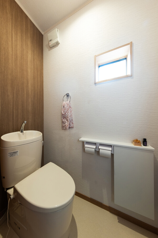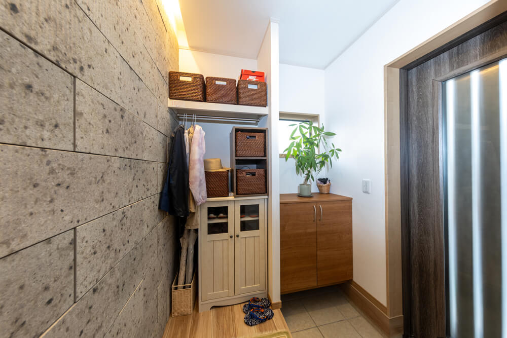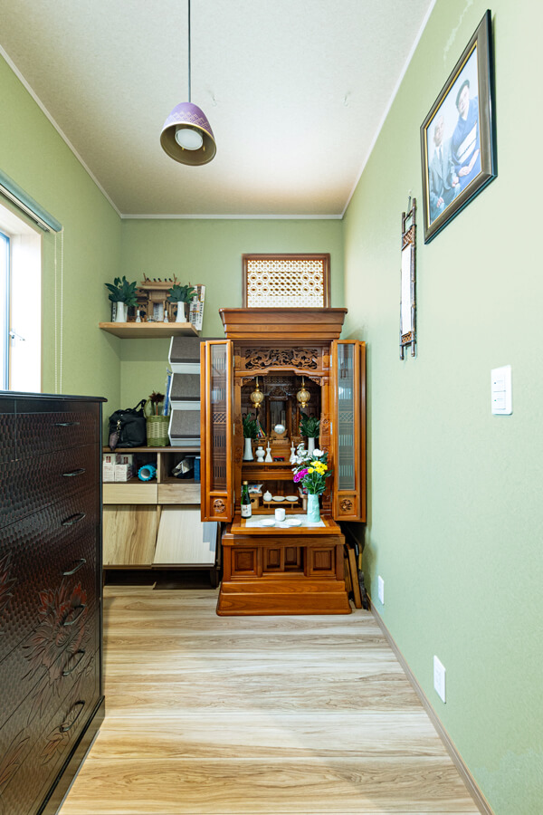 趣味と今の暮らしを大切に将来を見据えた2人にちょうどいい家 2026年4月1日 最終更新日時 : 2026年3月4日 shome_admin O様 蕎麦店を経営していた時には、すべて手作業で蕎麦を打っていたというご主人だけあって、奥様と二人でキッチンに立つことも多いという。その分、キッチンとカウンター間のスペースは広く確保してある。食事をとるのは、右手のダイニングテーブル。キッチンからは配膳しやすい距離感だ。 箪笥は以前からお持ちのもの︒処分も考えたが︑右の鎌倉彫の箪笥などは今買おうとすると高額になっていることから、持ち込むことに。エアコンのある壁側が南側だが、窓を極力減らした。温度の効率がよく、防犯上も有効だ。 カウンターで食事をすることも考えていたが、今はダイニングテーブルで食事している。ニッチに複数の電源を設置しているので、パソコン、携帯の定位置になっていて、便利スペースとして活躍している。 キッチンは壁付に。洗い物をしながらテレビが見られないこと以外は不満がないとのこと。「換気扇を部屋の端に設置したので、エアコンを最適な位置に設置できました 」とご主人。奥様は、「 換気扇は油汚れのことを考えると端がよかった」とメリットも多い。ご主人は、各部屋ごとのエアコンを使うが、リビングと趣味部屋の間の襖を開ければ、直接エアコンの空気が流れるため、奥様お一人の時は、キッチンのエアコン1台で1階は間に合わせている。 LDK と1階の洋室は襖を隔てているだけで、廊下は設けていない。お子様、お孫さんたちが来た時などは、襖を開けて広い空間として活用している。 将来寝室になる予定の1階洋室は、現在は趣味の部屋。オーディオセットと食器棚のアンティークなコレクションはご主人の趣味。奥様は趣味を超えたお仕事として着物の着付けを行うので、そのためのスペースとして、また着物類をしまって置く場所として活用している。 手に入れた鹿沼組子を家のどこかに使いたいと検討し、この窓にはめることに。LDKの他のとは趣を異にしたグリーンの和紙クロス、鎌倉彫の箪笥、かわいいペンダントライトなどもあいまって、特別なスペースが和のテイストでまとめられている。 トイレは、「安いものをわざと選びました」と言うご主人。電気的なものは壊れたら全部とりかえる必要があるが、電気的なものは使っていないので、壊れても部品を取り替えるだけですむ。「老後に急にお金がかかるようにはしたくない」というこだわりだと言う。ウォシュレットは後付けできるが必要を感じず、現在は付けていない。 玄関正面の壁は、大谷石に似た外壁材を使った。「本当は大谷石を使いたかった」というご主人だが、「職人さんが凹凸を付けセンスよく設置してくれ、夜は天井からの間接照明の影もいい雰囲気です」と、大満足。絵を飾るレールも用意したが、この壁の雰囲気がいいので、今は使っていない。 階段は通常よりも1段増やして緩やかな勾配にしてある。降りる時も安心。 2階の寝室。2面に窓があり明るい。「2階は1部屋だけで、トイレもあるので、どうしても隔離が必要な場合には、ここにいればすみます」と奥様。 収納はたっぷり。左は深い押入れ、右はクローゼット。中央のロールカーテンの中は、趣味のものが収められている。押入れの半分の深さで、反対側はその半分のスペースに洗面が設置されている。 トイレにも手洗いが付いていてあまり使わないが、2階で窓掃除など、水を使う時にはないと不便だという。 洗面脱衣室は脱ぎ着しやすいように広めに取った。車椅子が入っても余裕で回れるようになっている。 洗濯機の選び方もトイレ同様、なるべくシンプルなつくりのもので洗剤自動投入機能がない機種を選んだ。 下着や普段着はここに収納。洗濯物も簡単に片付けられ、洗剤類やトイレ用品はここに集約している。「収納はできるだけまとめたい。ありすぎると探してしまうから」と奥様。動きに無駄がないように考えられている。 蕎麦屋店は めても、県内でお料理教室を行なっていたり、奥様は着付けなどでもかけまわり、活発に活動されているO様ご夫妻。快適なお家で日々の生活も楽しんでいる。 O様邸の外観は、南側にあまり窓を設けておらず、玄関も南側の道路から見えないように設計されている。玄関側は、大谷石風の外壁材を使用してアクセントを付けている。
