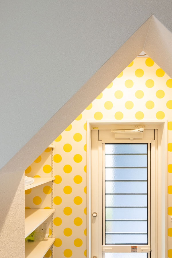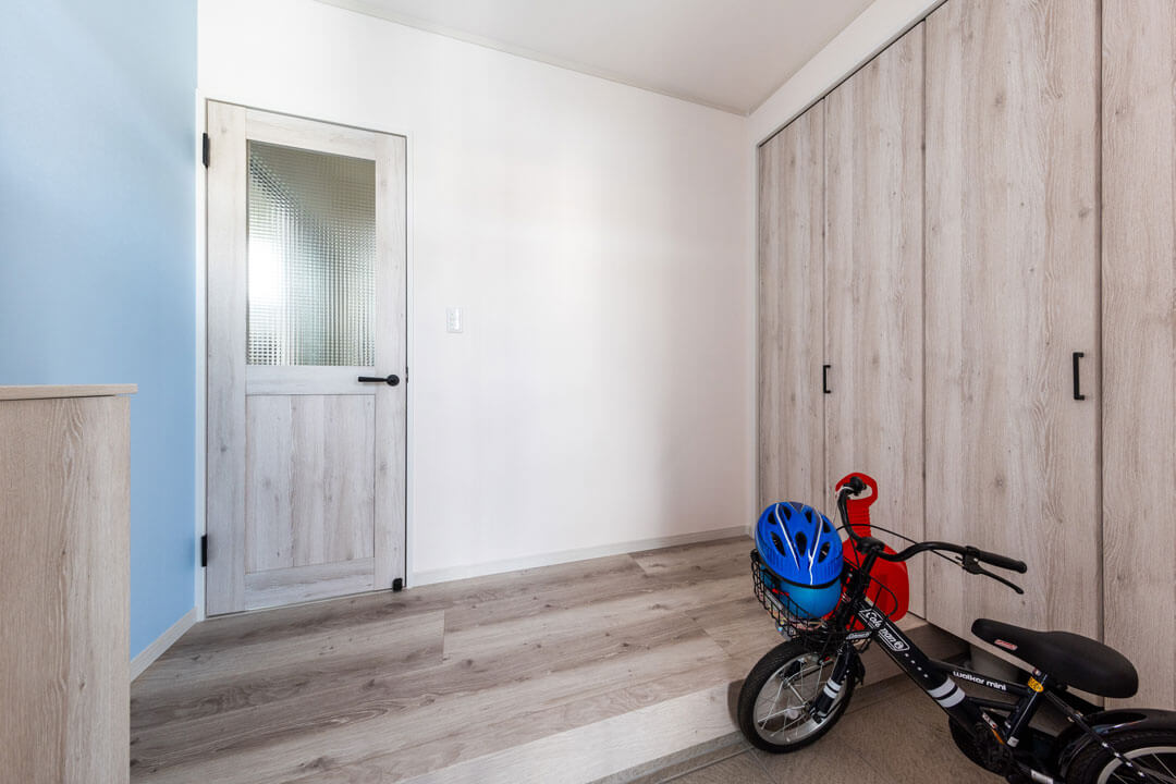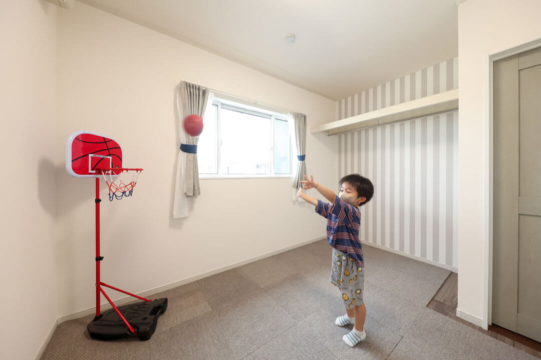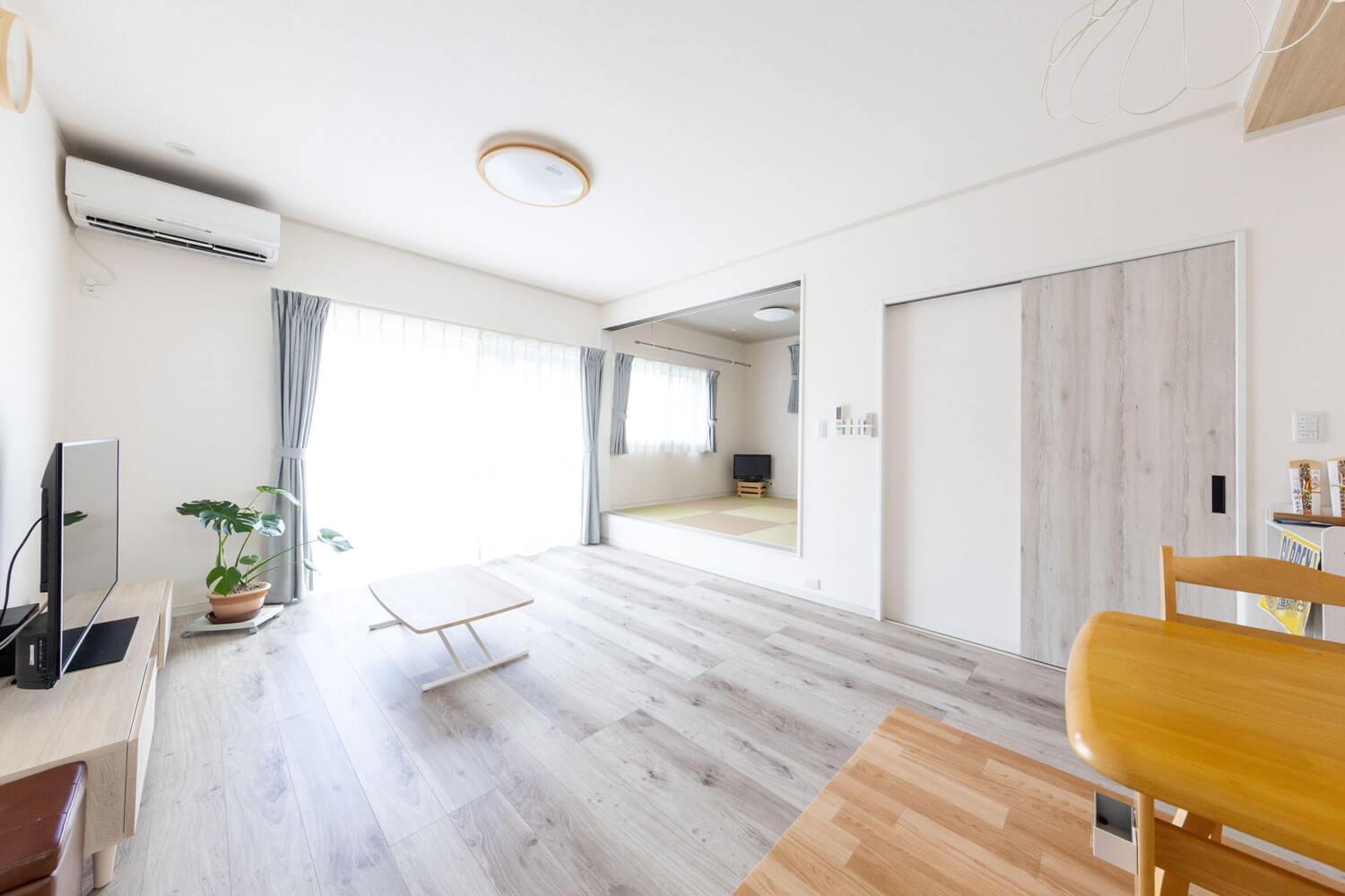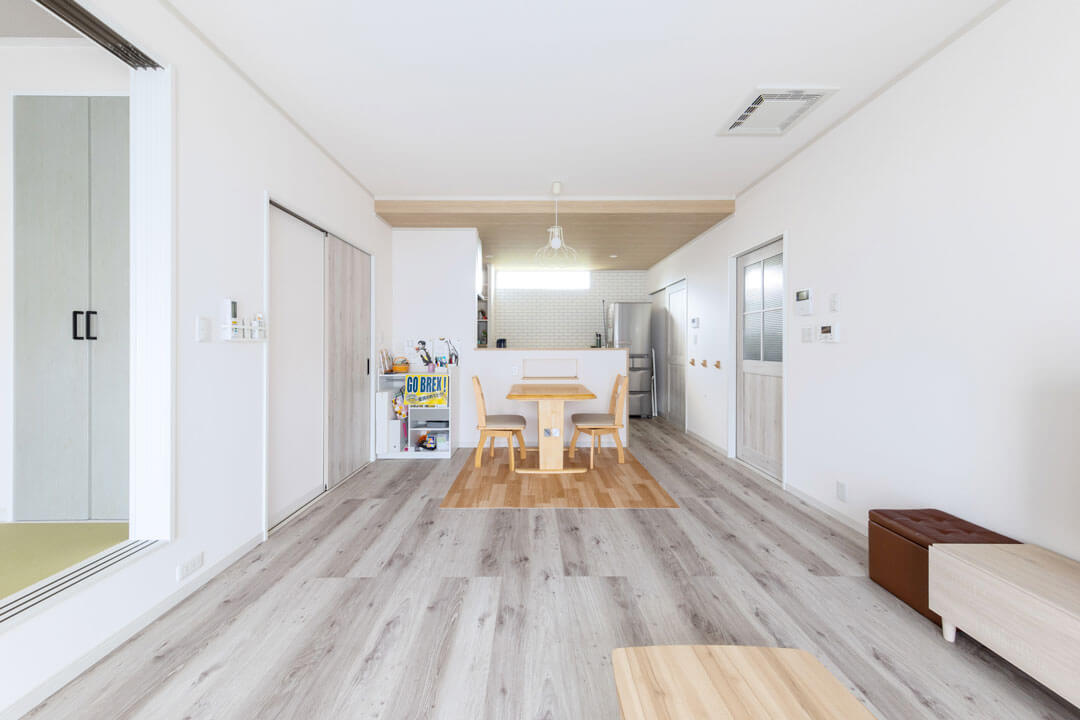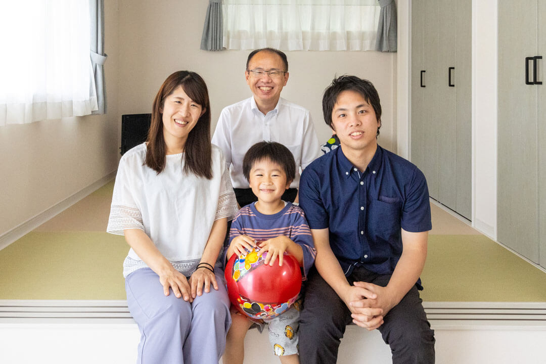 リビングでのびのびと遊ぶご長男と、小上がリで談笑する菊田様ご夫妻。現在はご長男の遊び場として活躍中の小上がリ。いつもは扉をはずし専用スペースに納めてある。閉めて個室にすることもでき、時に客間として、遠い将来には夫婦の寝室として、ライフステージに合った活用ができるフレキシブルなスペースだ。