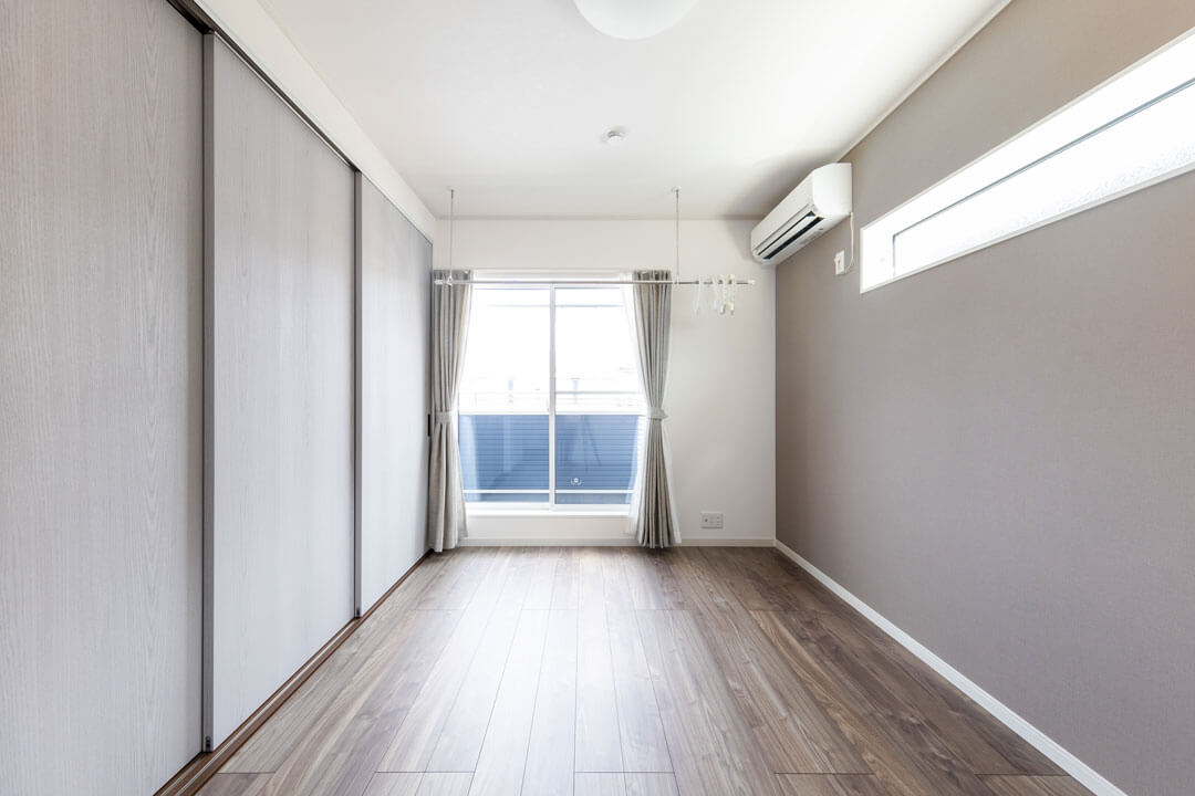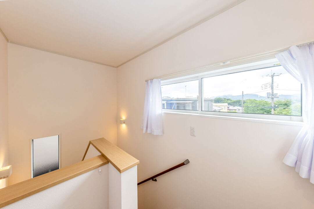 リビングの窓はワンサイズ大きなサイズに内装は外観のブルーグレーを軸にグレージュ系カラーで統一。すっきリ感のあるシンプルな色味に木目調をプラスすることで居心地のよさを感じる空間に。