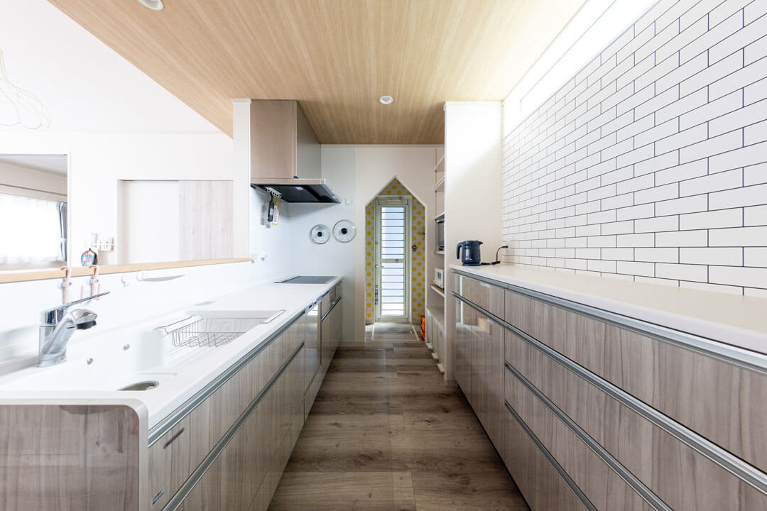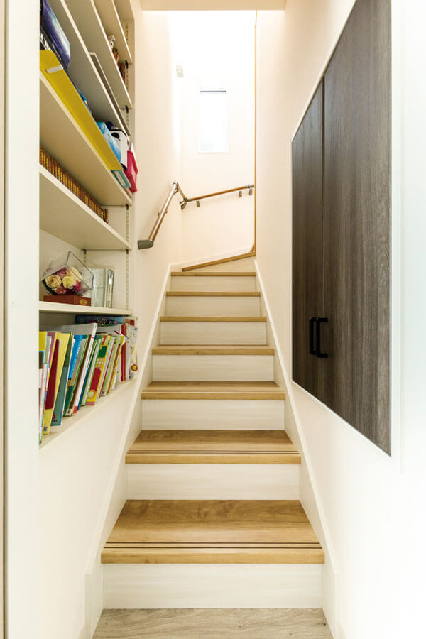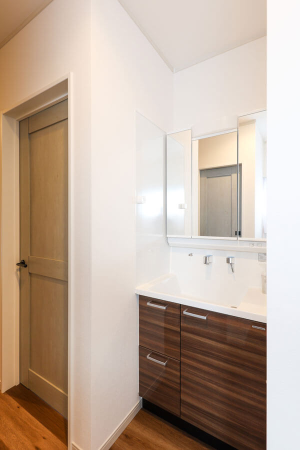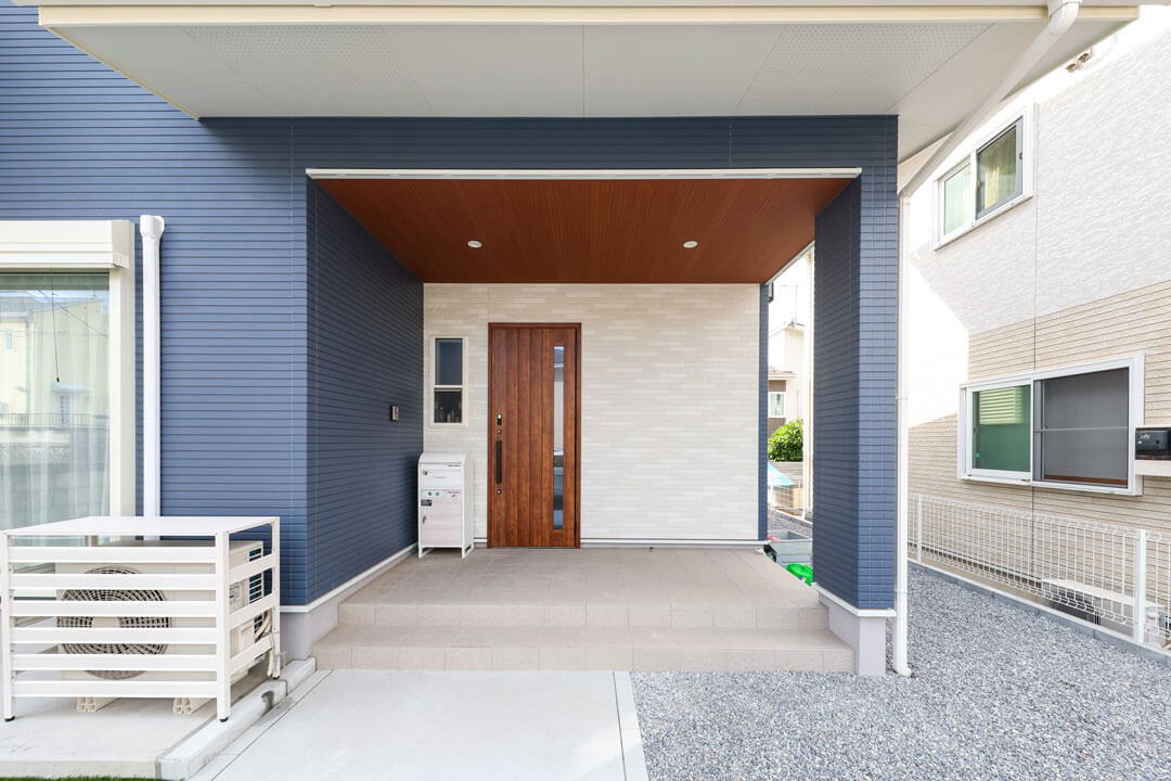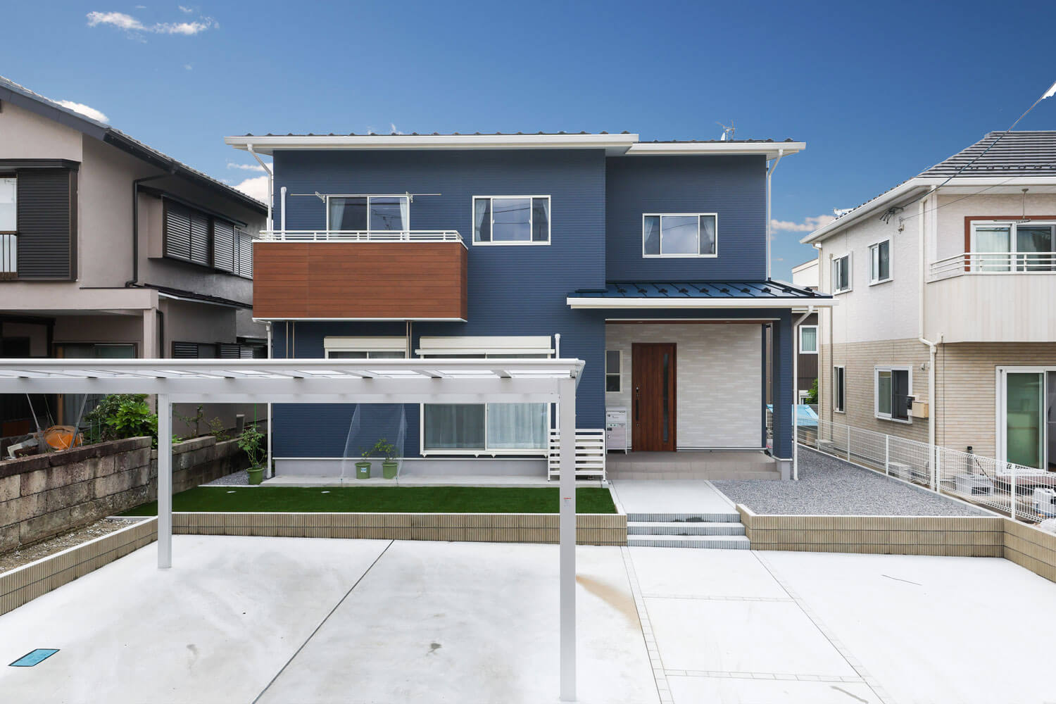 高台の一角にたたずむ菊田様邸。外壁にはオシャレなブルーグレー色のサイディングを採用。さわやかなホワイトと落ち着いた木目をアクセントに使い、スタイリッシュかつ品のよい柔らかな印象に。
